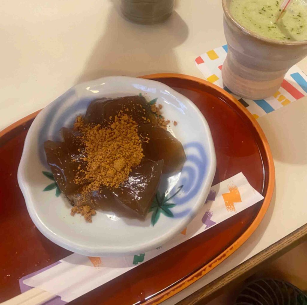 わらび餅はお箸ですくうのに少し手こずるくらいのモッタリさ。これでもか!とかかっているきなこを